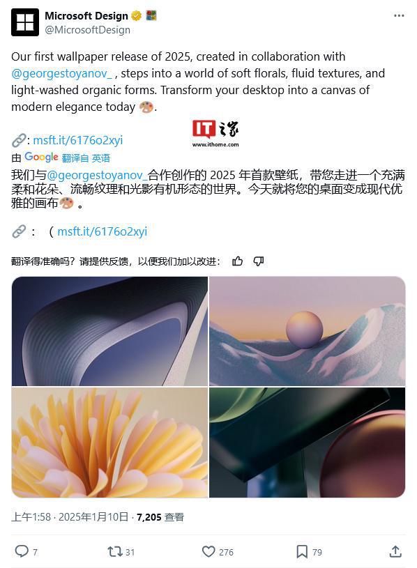 1 月 10 日消息,Microsoft Design 官方今天(1 月 10 日)在 X 平台发布推文,宣布推出名为“Fluid Textures”的壁纸系列,为 2025 年带来一抹清新气息。