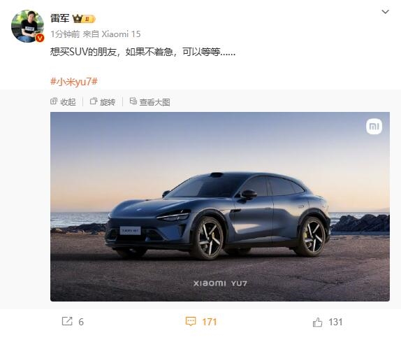 这表明雷军对于小米YU7有着极高的信心,并期待着与市场上其他优秀车型展开正面竞争。