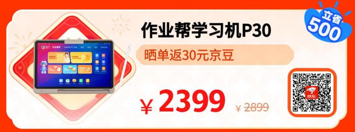 寒假正是拉开差距的时候,家长如果想要督促孩子好好利用假期,可以趁机来京东年货节下单学习机。小猿学练机趁早礼盒就是不错的选择,彩色墨水屏久看不伤眼,还能培养孩子的专注力,学习更专心,京东年货节期间立减600元,到手价3999元,还赠1年碎屏险。作业帮学习机P30,内含超18亿道精品题目,小初高全科作业都能辅导,活动到手价2399元,可享3期免息。