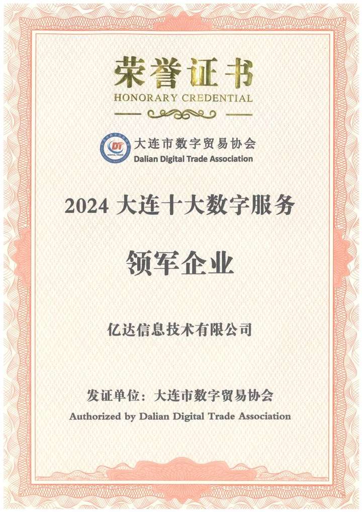1月9日,大连市数字贸易协会(以下称“数贸协会”)2025新春年会隆重举行,市商务局相关领导,数贸协会会长、亿达科创CEO李震洲,数贸协会成员企业代表等出席会议。会上发布数贸协会2024年度评选结果,亿达科创获评“2024大连十大数字服务领军企业”。