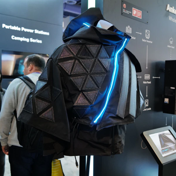 Anker推出的可穿戴太阳能电池板夹克无疑是本届CES的一大亮点。这件夹克采用了最新的钙钛矿太阳能技术,配合LED灯条装饰,看起来就像是从科幻电影中走出来的道具。不仅如此,它还能提供高达30W的最大输入功率,并配备了USB Type-C接口,方便用户随时随地为电子设备充电。