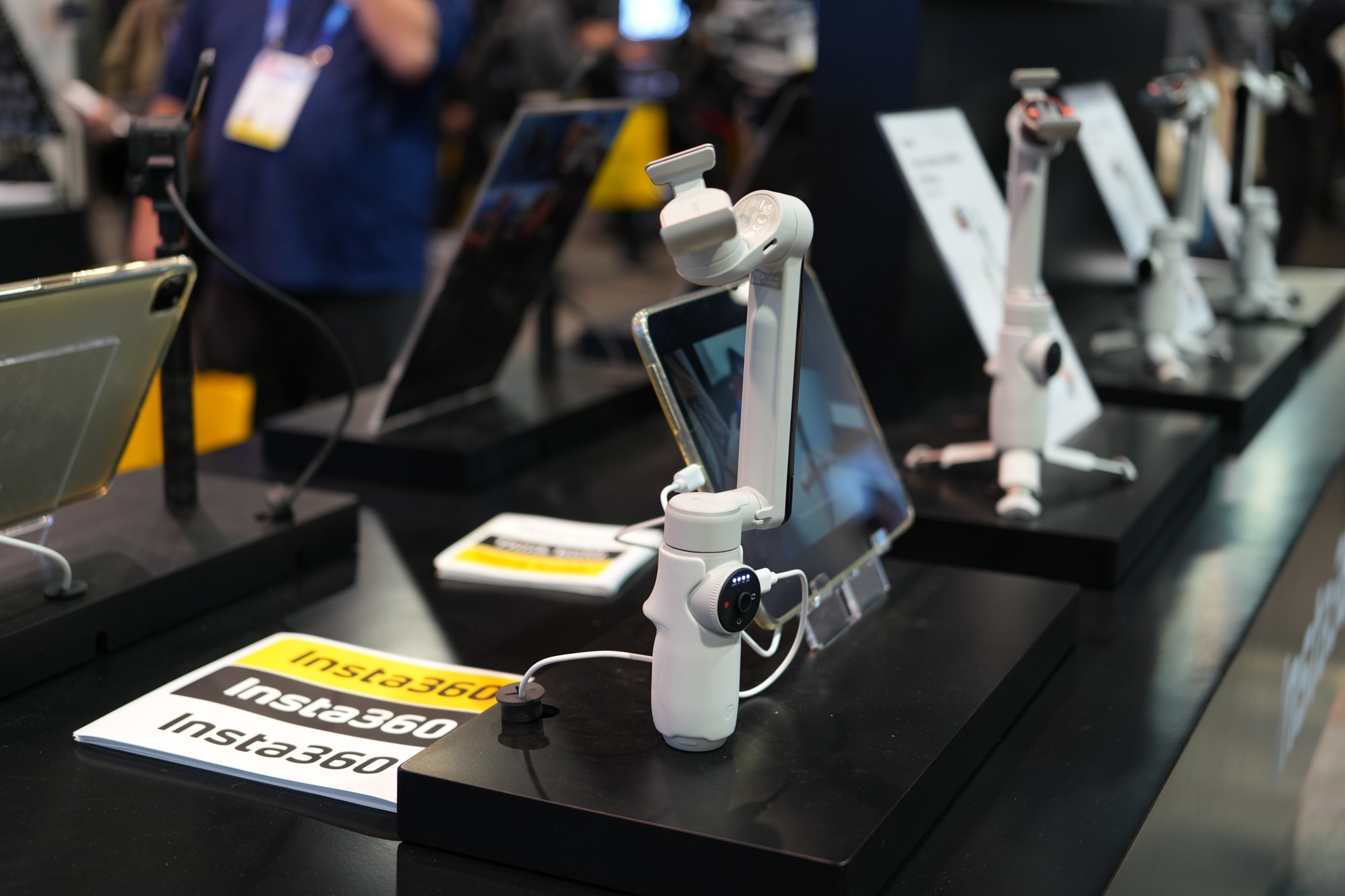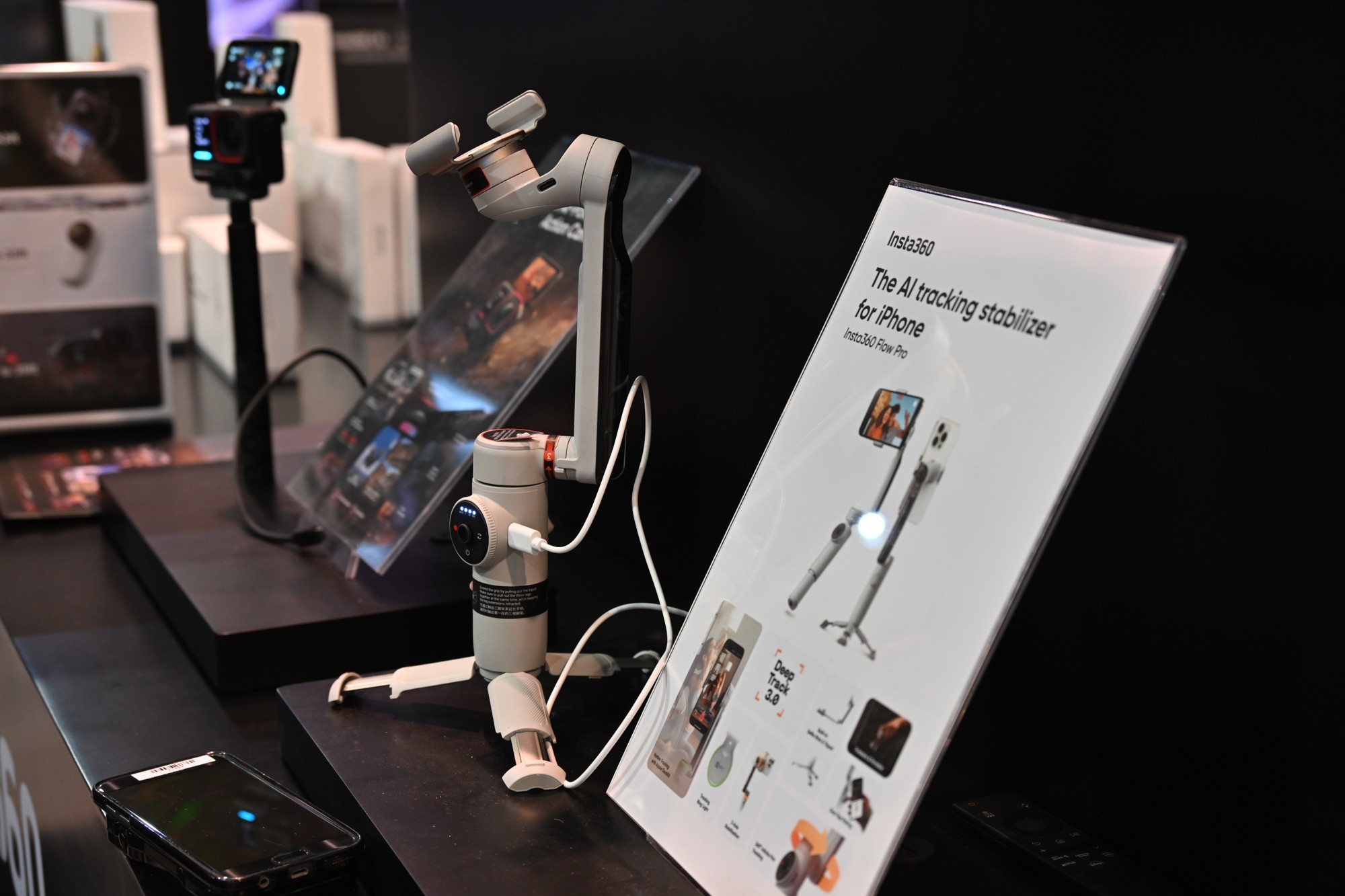 手机云台Flow Pro是展会观众最喜欢的产品之一,这款手机云台是影石基于AI影像技术,面相广大手机摄影市场推出的重量级产品,支持苹果DockKit技术,Flow Pro大大简化的手机稳定器拍摄的操作步骤,并且在会吃社交、直播、会议等内容,包括Blackmagic Camera、美图秀秀、小红书、飞书等均可搭配Flow Pro使用。