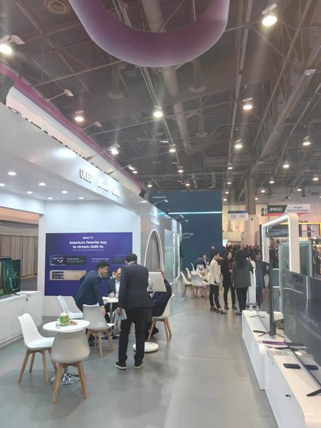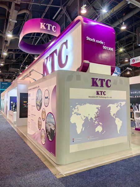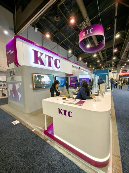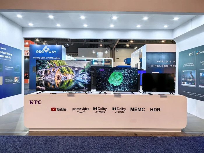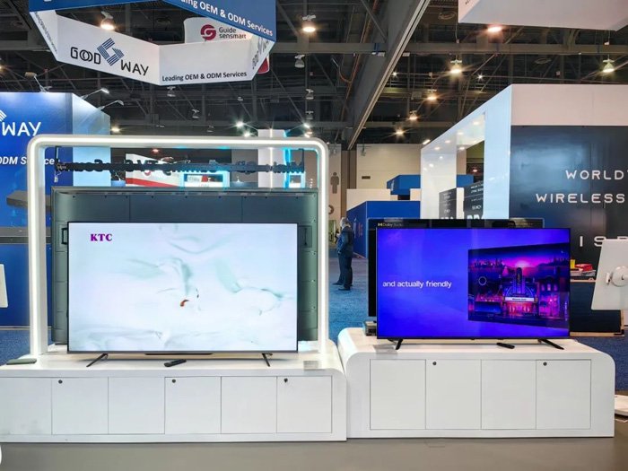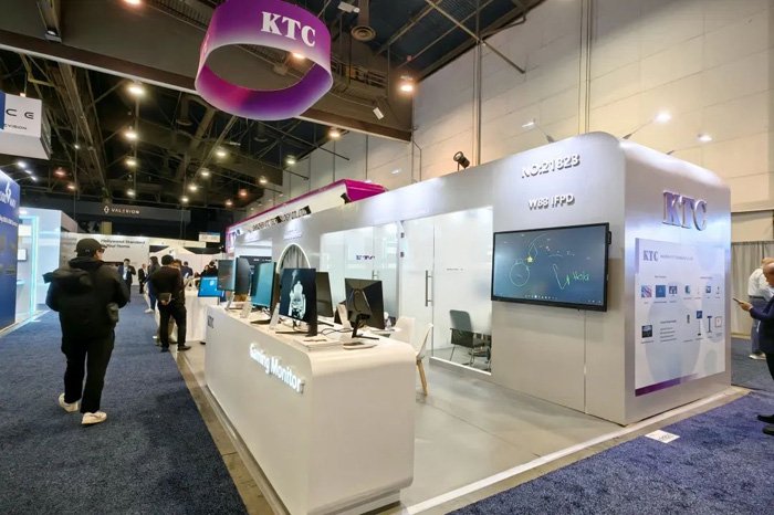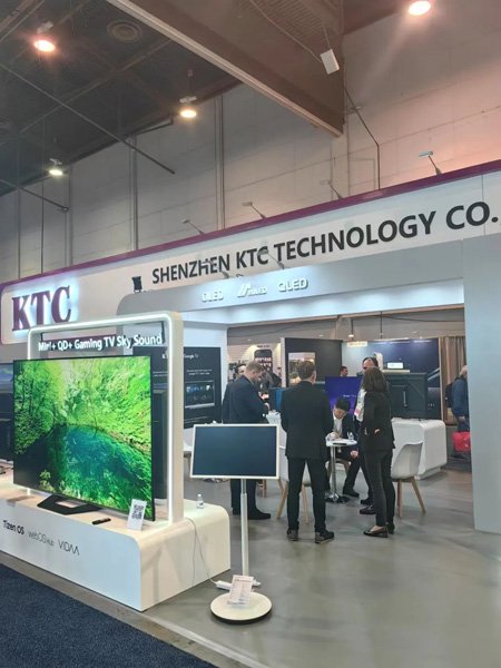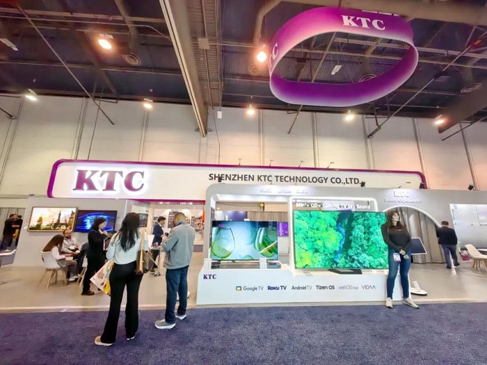 康冠科技的展台设计独具匠心,整体以简洁大气的白色为主色调,搭配醒目的紫色元素,形成了鲜明的视觉冲击。紫色的 “KTC” 标志高悬于展台上方,宛如一颗璀璨的明星,在展会现场熠熠生辉,吸引了众多参观者的目光。