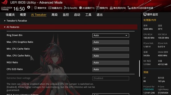 下面我们来看一下华硕Z890 RO姬主板的BIOS,与吹雪一样,这次华硕给RO姬也准备了定制化UEFI风格界面,在菜单背景甚至加载界面都能看到RO姬小姐姐的身影。