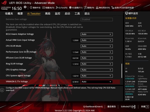 各类电压选项都能在Ai Tweaker几面底部找到,甚至包含酷睿Ultra 200S平台最新的VNNAON设置,主要针对PCIe以及核显的电压。