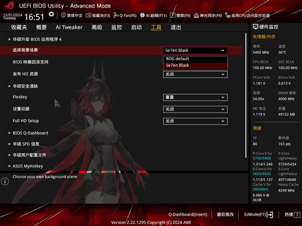 另外值得一提的是如果喜欢原本ROG风格的菜单,可以在工具界面的背景场景选项中进行切换,默认为Se7en Black也就是RO姬风格。