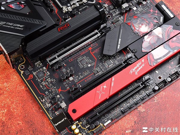 此外这次华硕VRM散热装甲,南桥PCH散热片以及CPU顶盖上都印上了RO姬小姐姐形象,华硕VRM散热装甲的RO姬小姐姐与发光RGB败家之眼LOGO搭配相得益彰,仿佛一位翩翩起舞的歌姬偶像一样,整体设计和谐统一,毫无突兀之感。