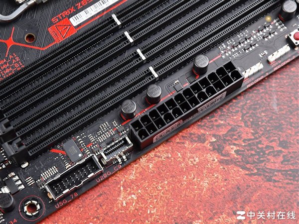 跳线方面,华硕Z890 RO姬主板在前置跳线区域也准备了一个USB 3.2 Gen2x2 Type-C(20Gbps)接针,旁边是一个USB 3.2 Gen1(5Gbps)接针。