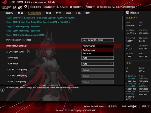 来到Ai Tweaker界面,这是华硕主板重要超频设置界面,集成了CPU、内存、电压等设置参数。其中也包括英特尔主推的Intel Default Settings设置,因为我们使用的是旗舰Ultra 9 285K,可选择Performance和Extreme两种模式,注意如果使用的是Ultra 5和Ultra 7而不是Ultra 9,则会见不到Extreme档位,而额外提供一个Baseline档位。