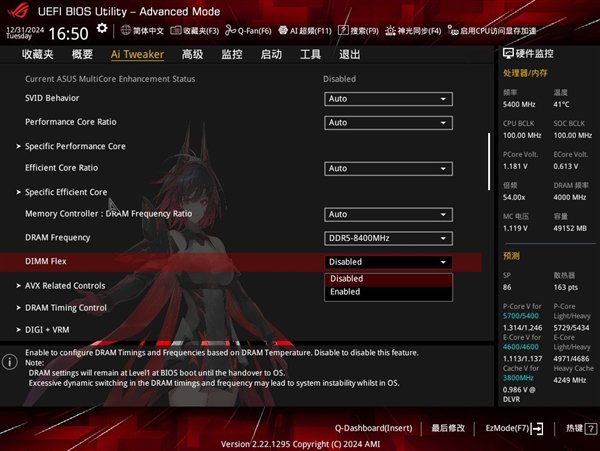 针对内存超频,华硕提供了DIMM Flex设置,这是非常实用的AI超频功能,开启后就会一键优化内存小参,剩下了大量手动调节的时间,还能增强内存性能表现,内存稳定的情况下,建议开启尝试。