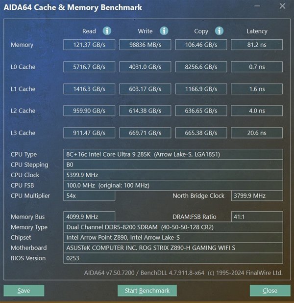 我们首先测试了华硕Z890 RO姬主板的内存性能表现,将内存超频至DDR5 8200MT/s,并使用AIDA 64进行内存跑分。