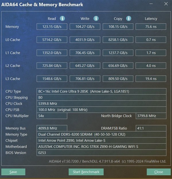 可以看到在开启了华硕Z890 RO姬主板的DIMM Flex后,内存整体表现有了很大进步,内存读取提升至123.15GB/s,写入提升至104.27GB/s,复制提升至108.15GB/s,延迟降低至75.6ns,一个选项就带来立竿见影的变化。
