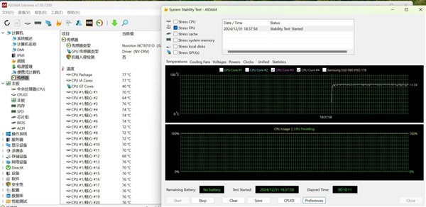 此时我们也记录了Extreme档位拷机时的温度和功耗,在拷机10分钟后,温度稳定在77℃,功耗在240W,这样的压力对于华硕Z890 RO姬主板确实不大,保证稳定运行。此时性能和能耗比也达到了英特尔的标准,在更低功耗的情况下基准性能接近上代旗舰i9-14900K。