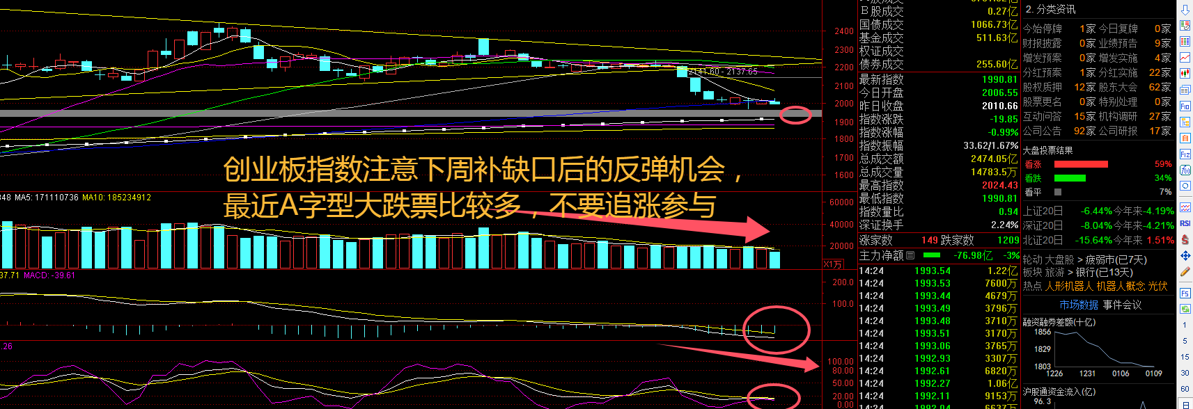 创业板指数周五盘中波动有点大,不过微盘股出现冲高回落,大票寒武纪、中兴通讯等纷纷大涨,又是一波问你:“还不割肉来大盘股?”在管理层定调“稳住”股市的政策基调下,A股市场的下行风险将是总体受控的。如果目前位置指数横盘后再度意外回落,将迎来比较好的中线介入机会。本周只有局部少数板块的机会,而真正上涨的个股数量有限,再看看中百集团、东百集团等等强势消费股接近“斩腰”了,顺钠股份、海得控制都趴地板了,短线资金明显开始“休息”了。接下来注意创业板指数能否在2000点之上稳住。