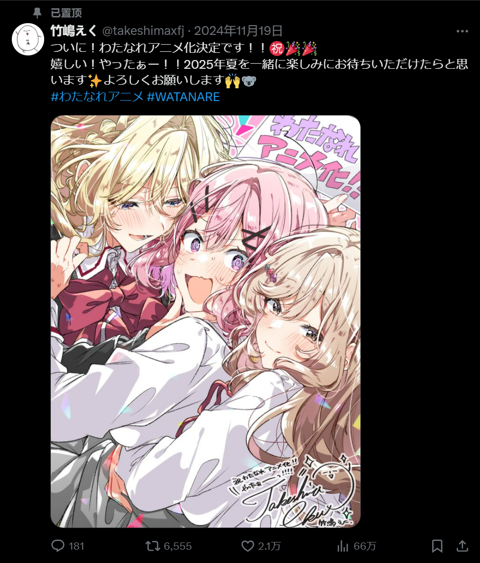 好在竹嶋也并没有真的就此一蹶不振——由其担任插画的百合轻小说《我们不可能成为恋人!绝对不行。(※似乎可行?)》也将在今年夏天被改编为动画播出,看得出竹嶋也由此再次燃起了希望与兴奋。