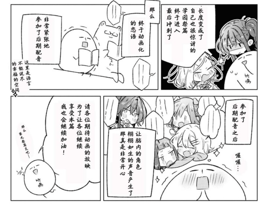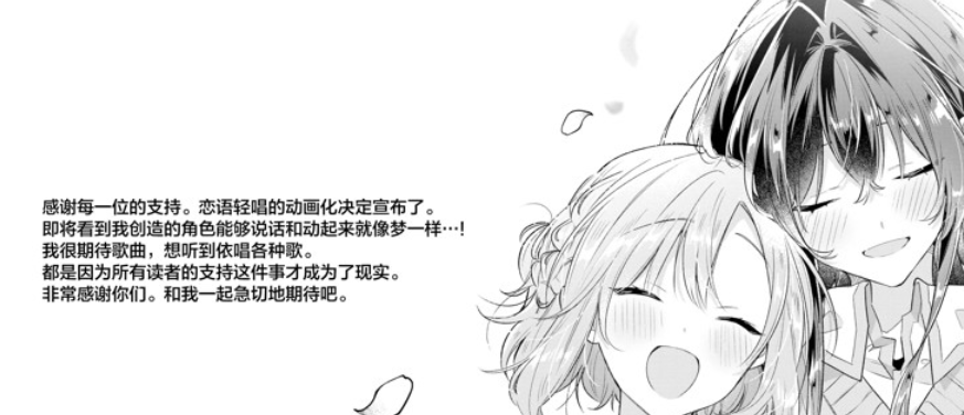半年之后的漫画第8卷单行本里,竹嶋向读者们传达了亲自参加了后期配音工作的消息。如果不出意外的话,《恋语轻唱》的粉丝们理应在不久后等来心心念念的动画。