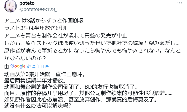 而在6月1日,不堪重负的《恋语轻唱》动画制作团队终于沦落到了“万策尽”的地步,宣布将临时插播两集总集篇来缓和工作状况。考虑到电视台的节目排期早已确定,这么做必然导致动画最后两集被迫延期,《恋语轻唱》的第11集与第12集究竟会不会播,以及什么时候才会播,完全成了未知数。
