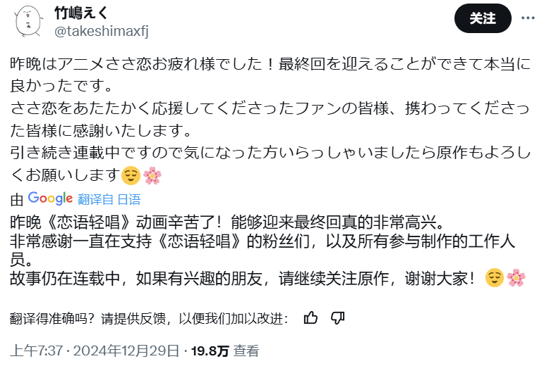 自动画第3话播出之后,竹嶋这半年来的推文只有两条提到了《恋语轻唱》动画。一条是去年6月通知大家最后两话择日再播,另一条则是在动画完结之时感谢粉丝们一路以来的支持与陪伴。随便翻阅粉丝们为竹嶋写下的留言,字里行间全是遗憾与惋惜之情。