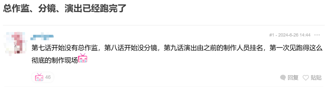 没人能确保这位网友提供的信息是否真实可信,但我们还是能通过动画传递出的信息一窥制作现场的混乱,比如有网友在观察本作的表记时发现,总作监、分镜、演出等职位均在不同集数出现了缺席情况,照这么看似乎也对应得上之前爆料的那些行业内幕。