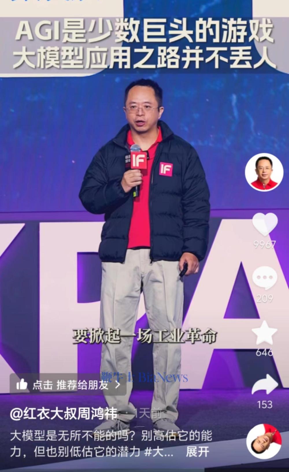 鞭牛士 1月11日消息,周鸿祎昨日发布了一条视频,谈到自己对大模型的看法,他表示,解决问题的关键是放弃对大模型的执念。
