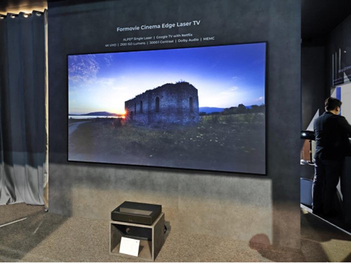 峰米科技本次展出了两款备受瞩目的新品Google TV激光电视——Formovie Theater Premium与Formovie Cinema Edge。搭载 Google TV 操作系统,系统界面简洁,操作方便,支持多种应用程序的安装和使用,可连接网络观看在线视频、浏览网页、玩游戏等,还支持语音操控,用户可以通过语音指令快速搜索影片、调整音量、切换频道等。