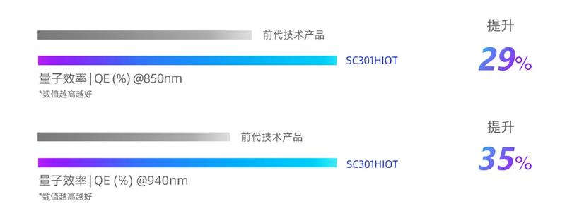 SC301HIOT基于思特威全新DSI™-2 Plus工艺技术打造,通过优化硅片外延以及前道工艺,实现了近红外感度的大幅提升。与前代技术产品相比,SC301HIOT在850nm波段下峰值量子效率(peak QE)提升了约29%,在940nm波段下峰值量子效率(peak QE)提升了约35%,在夜晚红外灯场景下,能为摄像头提供更清晰、明亮的影像。