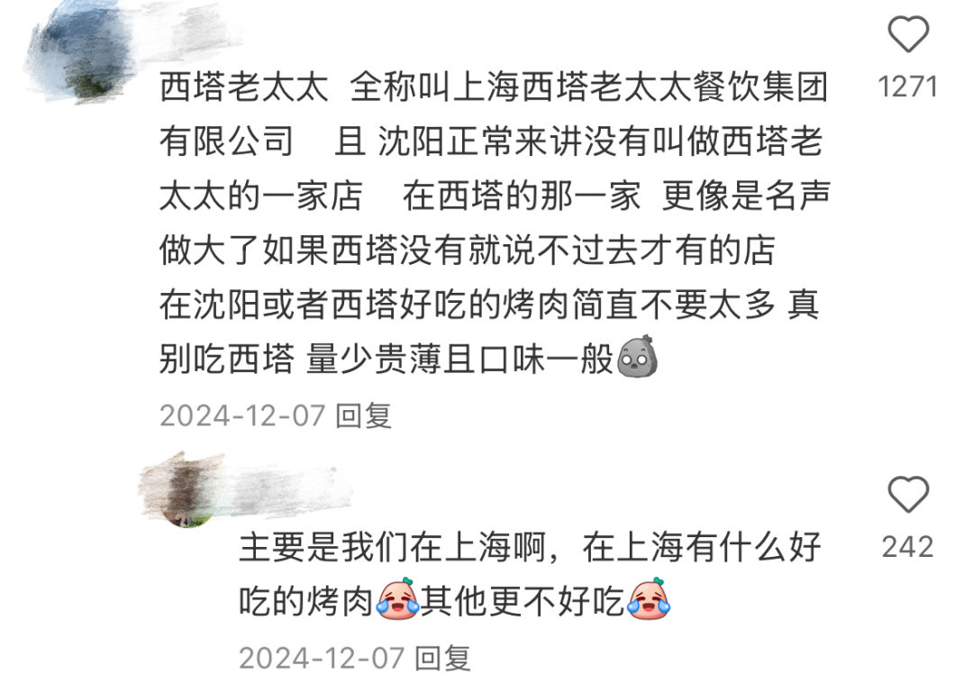 巧合的是,故事内核紧贴大东北的西塔老太太实则也是一家上海公司,全称叫上海西塔老太太餐饮集团有限公司。眼瞅着东北烤肉摇身一变成为上海系,上海网友章二摸不着,“上海啥时候还有烤肉文化了?难道是烧鸟?”