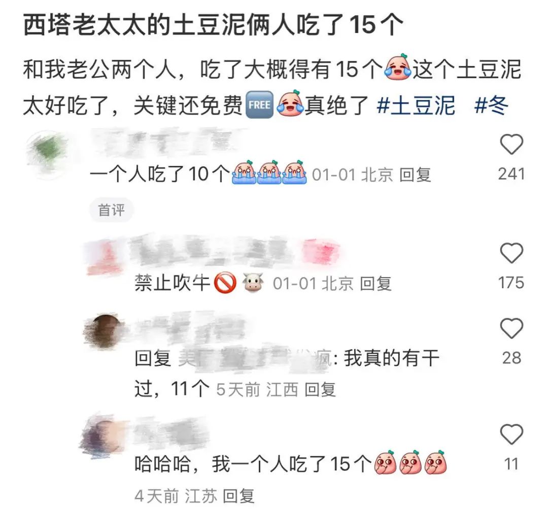在社交平台上,金老太最火的是免费土豆泥,有人一次最多吃16个,有人外带打包一满盒。所谓“西塔老太太最的不是烤肉,而是免费的土豆泥”,不少测评博主放出豪言:去西塔老太太为的就是这细腻浓郁的土豆泥。