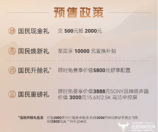 另外,价格方面,该车型正式开启预售,预售价区间为10.99-15.69万元。现在下定可享交500元抵2000元权益,还有至高10000元国民焕新礼品,限时免费享5800元国民升舱礼以及3888元SONY品牌扬声器和3000元15.6英寸2.5K高清中控屏的国民重磅礼。