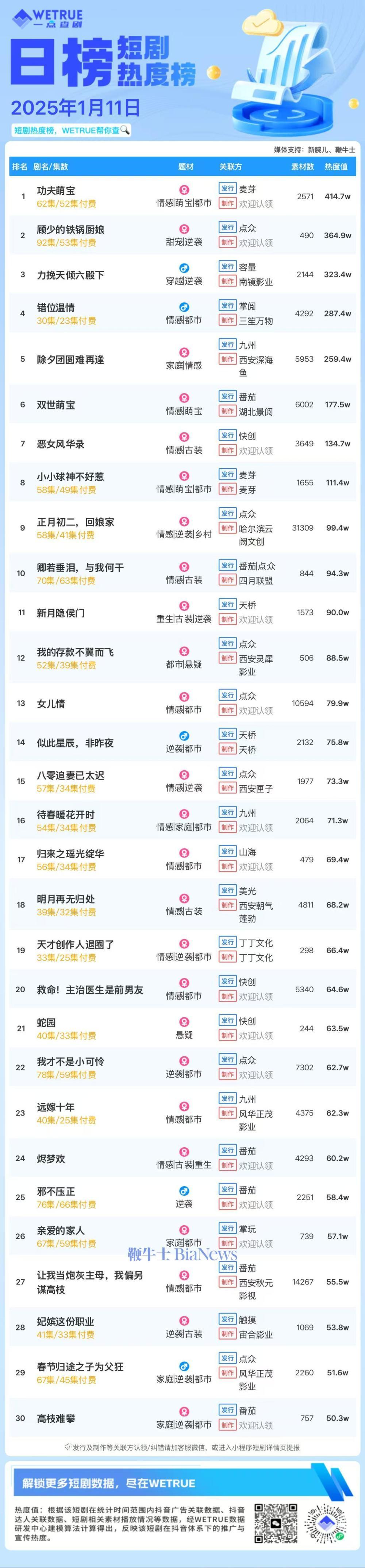 编者按:为帮助短剧从业者提供更多信息,专注于短剧报道的新腕儿和科技媒体鞭牛士联合WETRUE短剧热度榜共同推出短剧热度榜。