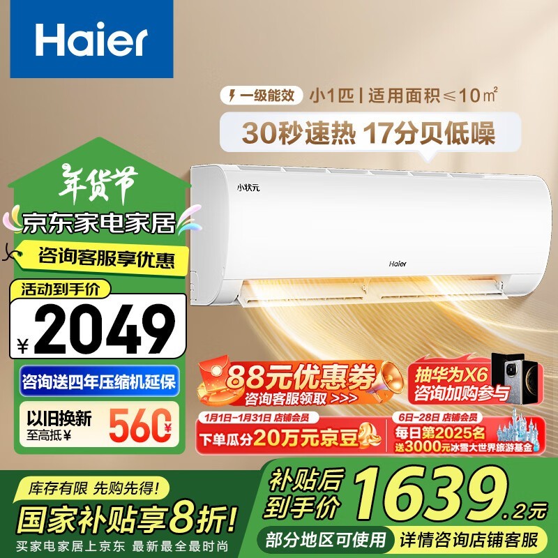海尔一级能效空调1319元秒杀中 限时优惠