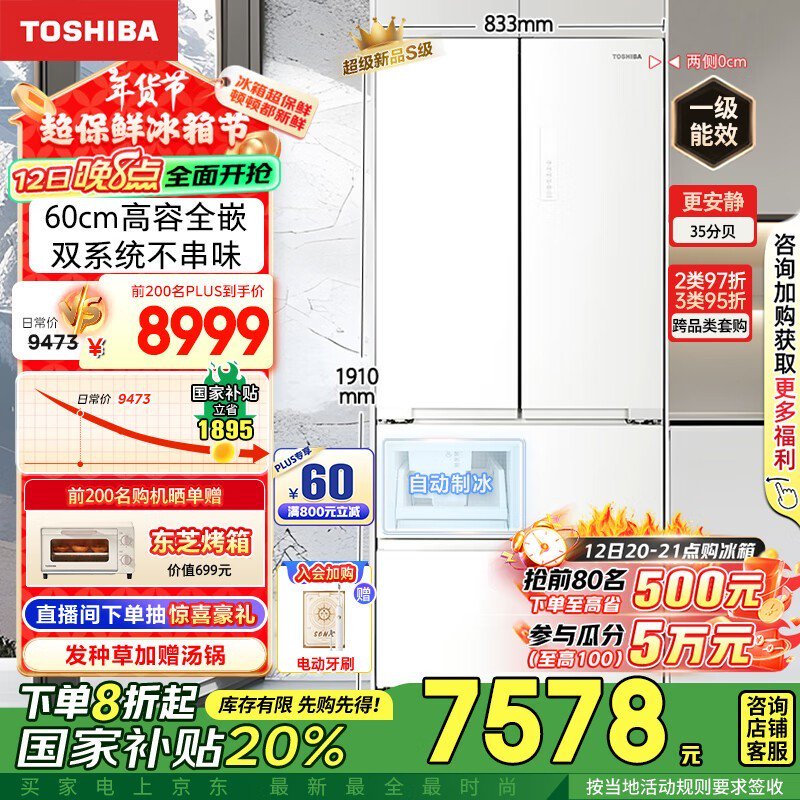东芝白珍珠法式多门冰箱548双系统超薄嵌入大容量自动制冰冰箱7150.92