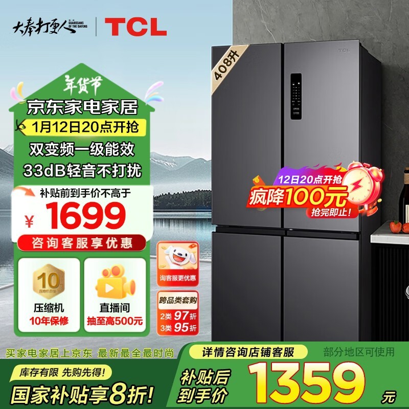 TCL BCD-408WPJD十字对开门冰箱:1119元到手!