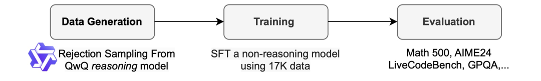 为了生成训练数据,团队使用了 QwQ-32B-Preview,这是一个开源模型,其推理能力与 o1-preview 相当。团队对数据混合进行了整理,以涵盖需要推理的不同领域,并采用拒绝采样程序来提高数据质量。