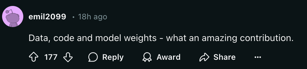 大家惊呼:「数据、代码和模型权重,多么惊人的贡献。」
