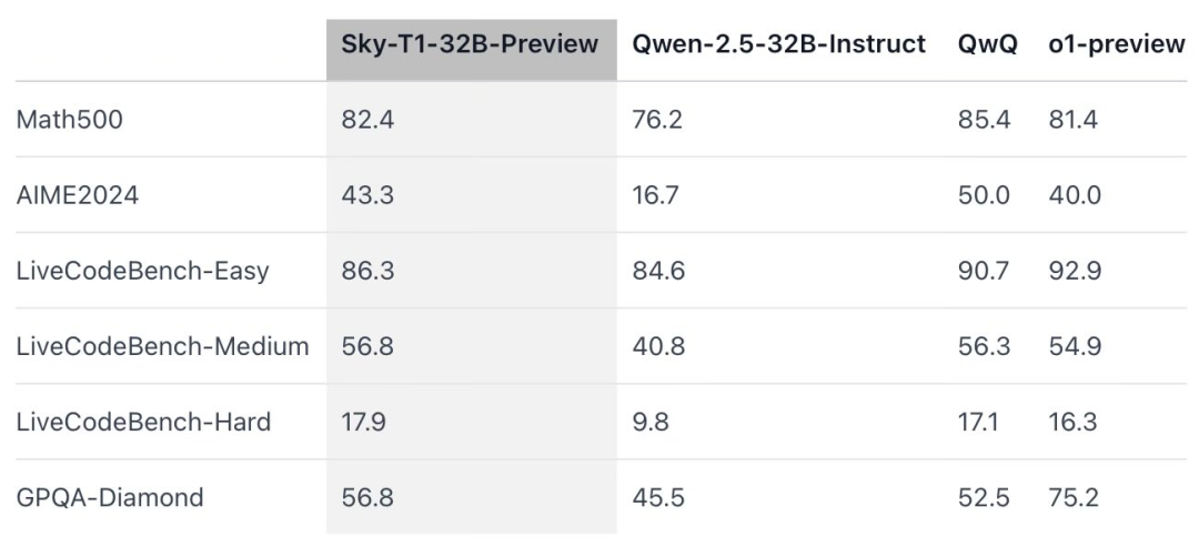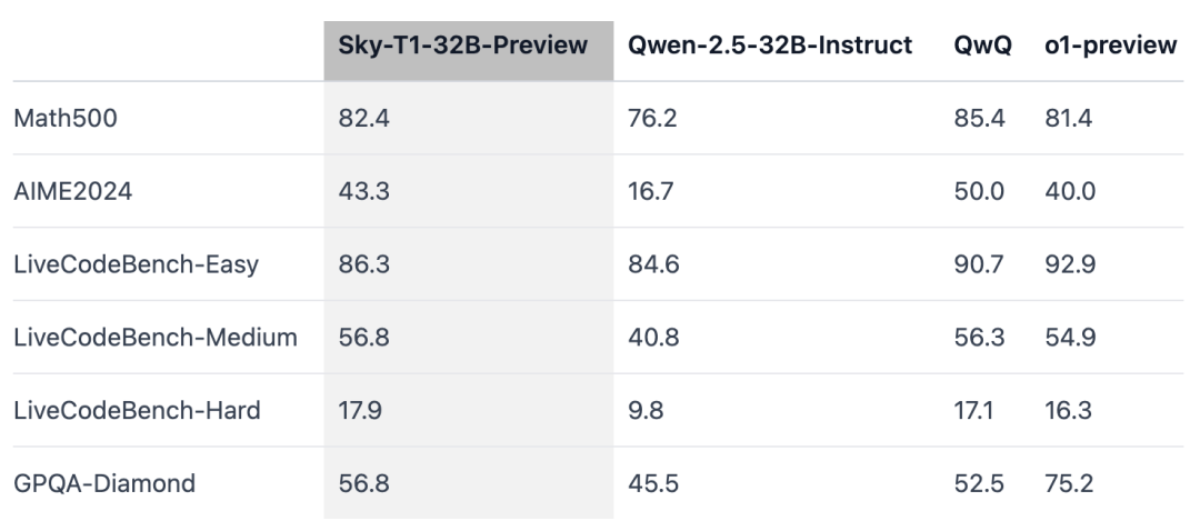 在 Sky-T1-32B-Preview 这项工作中,团队不仅在数学方面取得了有竞争力的推理性能,而且在同一模型的编码方面也取得了有竞争力的推理性能。