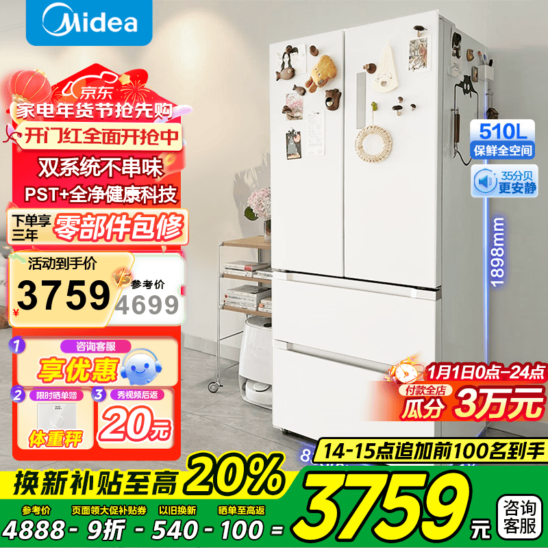 美的 BCD-508WTPZME 风冷多门冰箱:到手价3321元