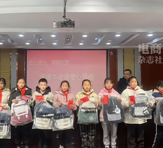 据媒体报道,在宿迁市宿豫区来龙中心小学报告厅举行了一场捐赠仪式,捐赠者周维华老师,曾是刘强东四年级的语文老师,他为宿豫区来龙中心小学64位贫困学生购买了书包,并每人赠送500元现金。