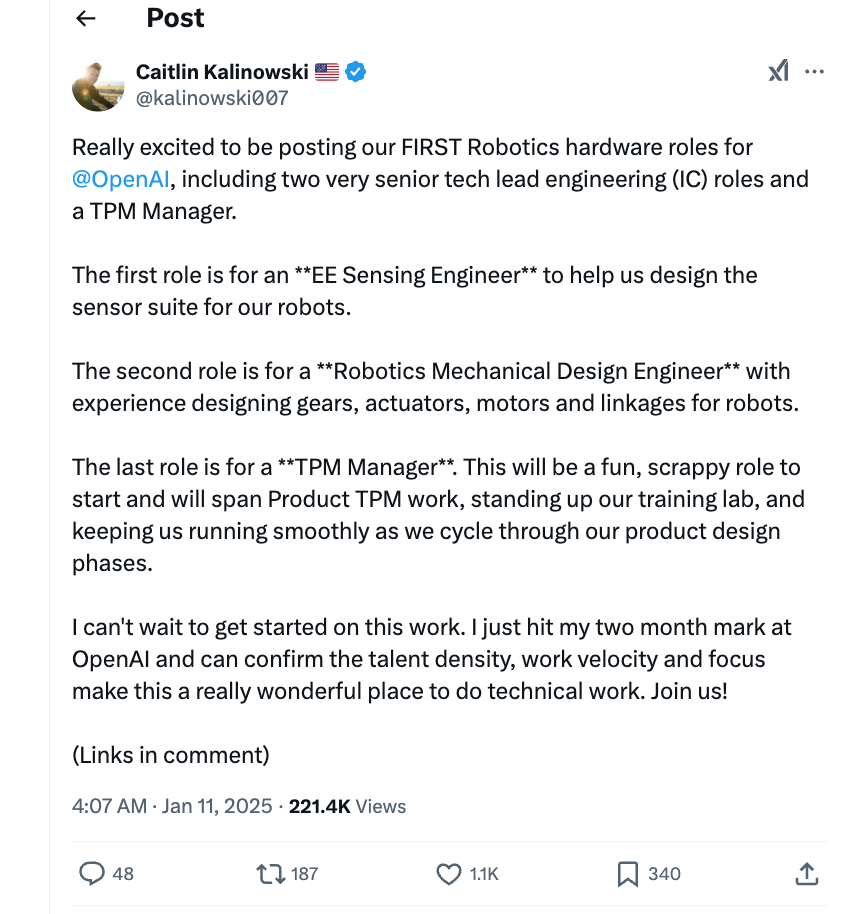 去年 11 月,从 Meta 的 AR 眼镜部门跳槽到 OpenAI 来负责硬件部门的 Caitlin Kalinowski 在 X 平台透露,OpenAI 将开发配备定制传感器的机器人。