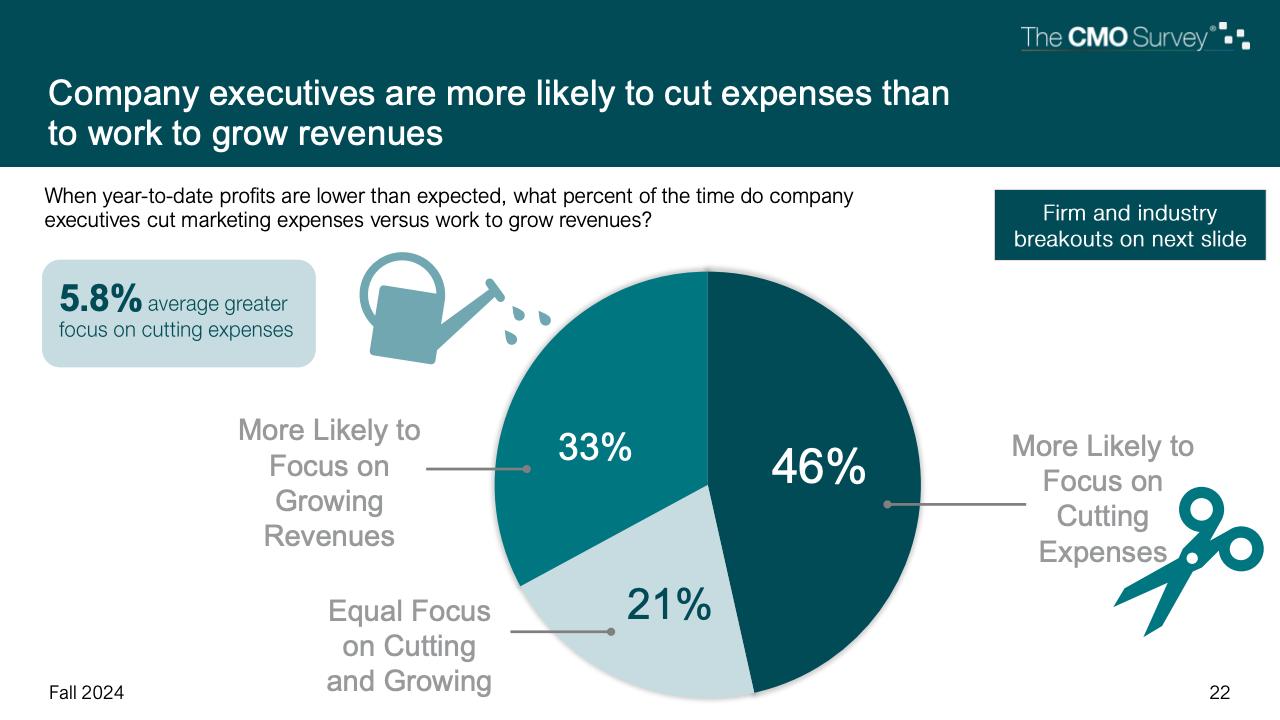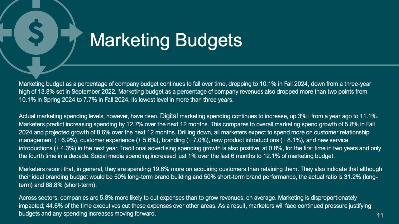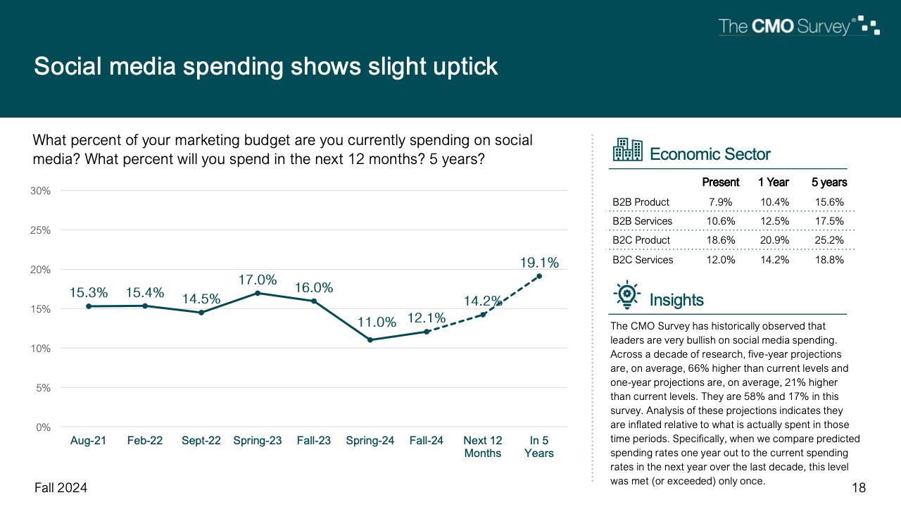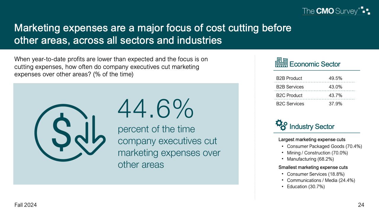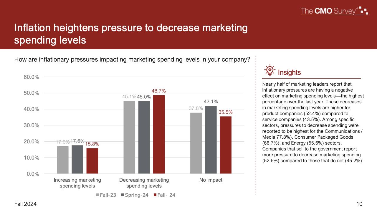 进一步下降的是首席营销官对营销费用占公司销售收入比例的估计。在最新的2024年秋季报告中,这一比例降至7.7%,是大流行和大流行后时代的最低比例。