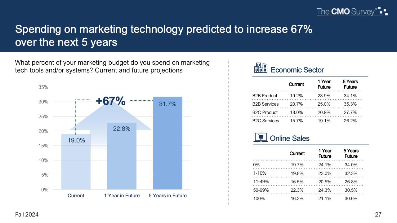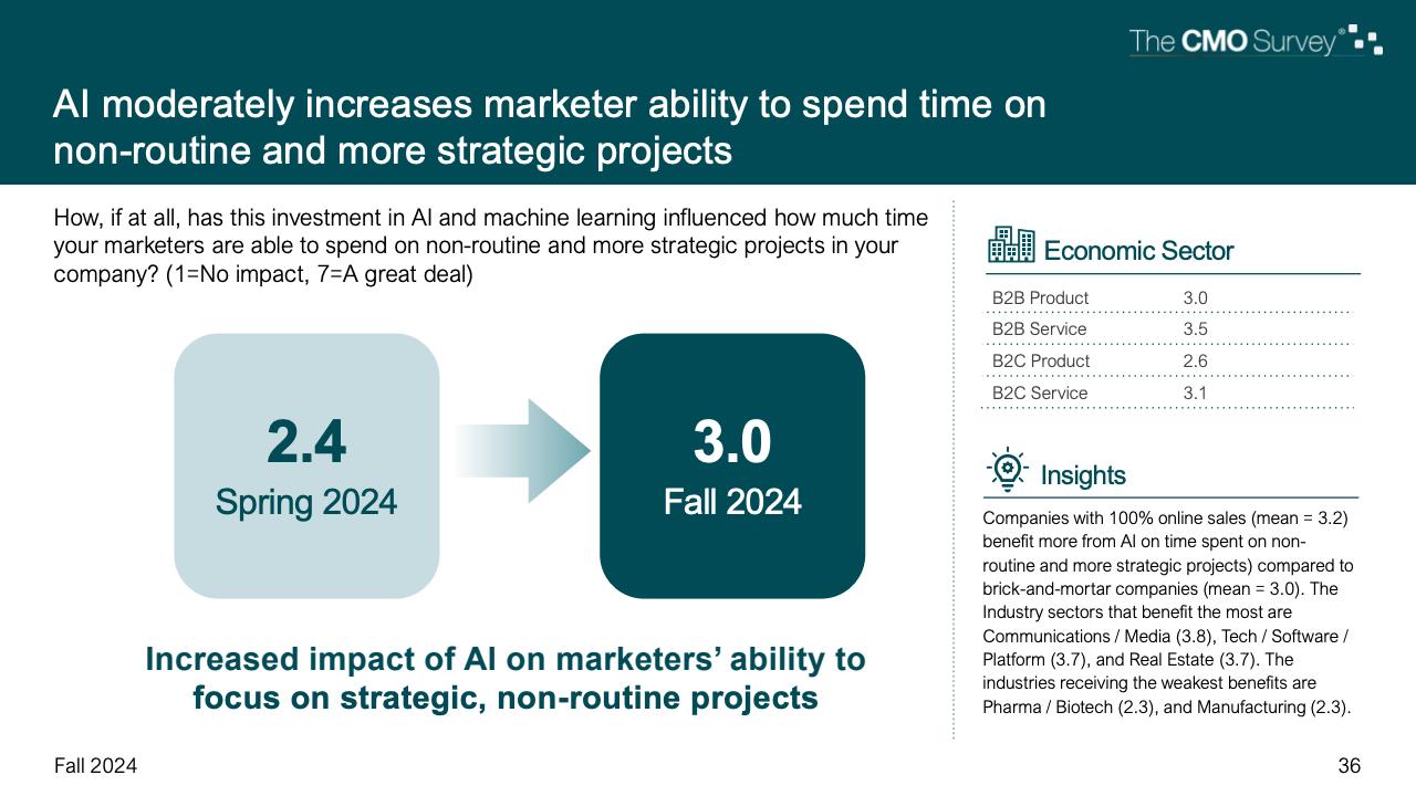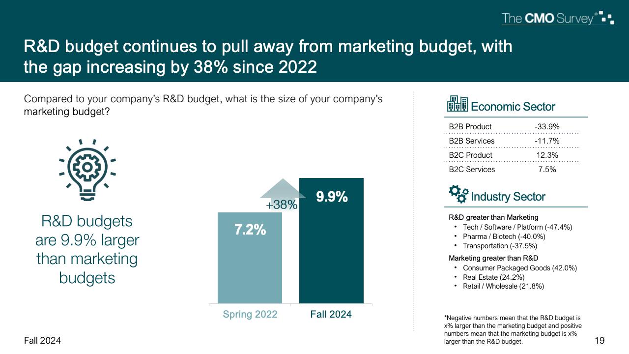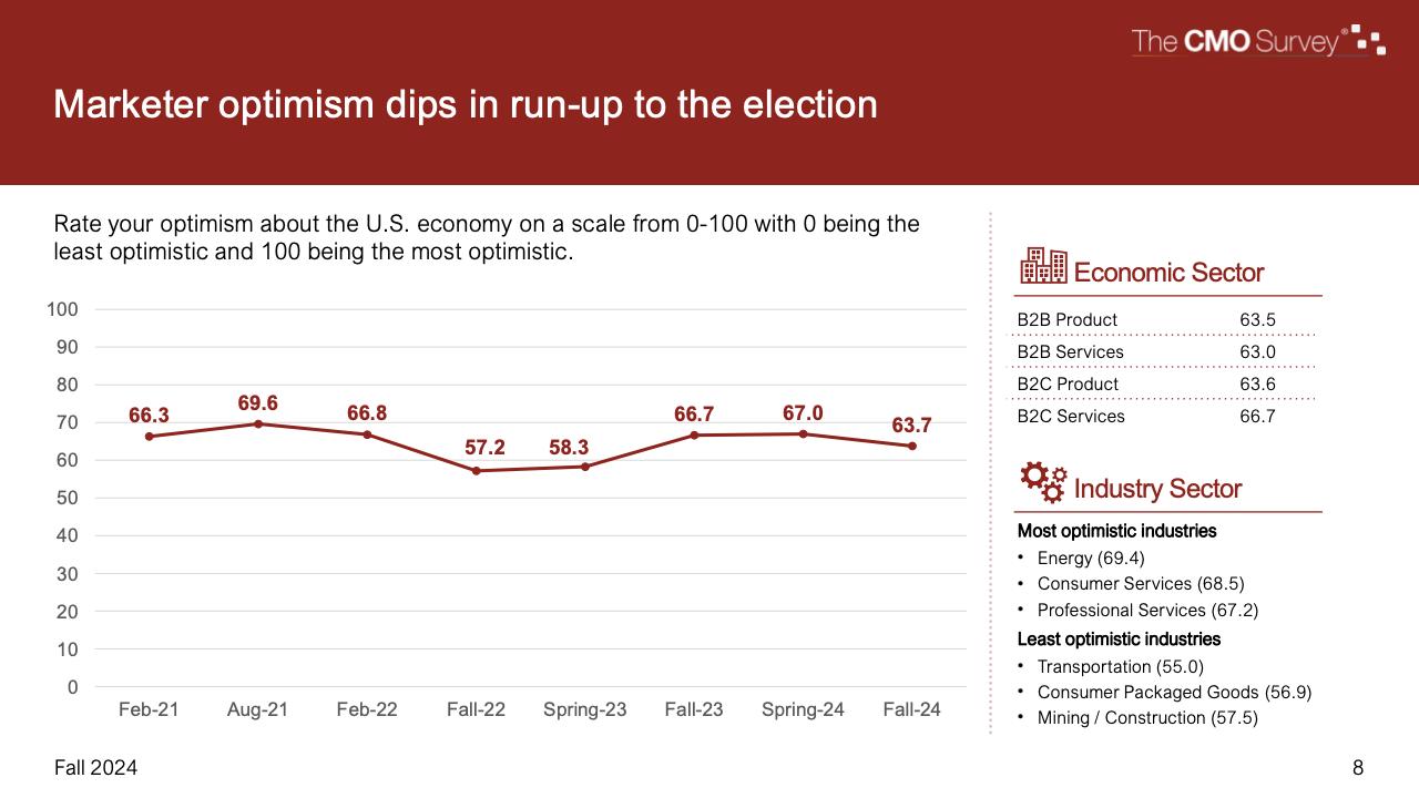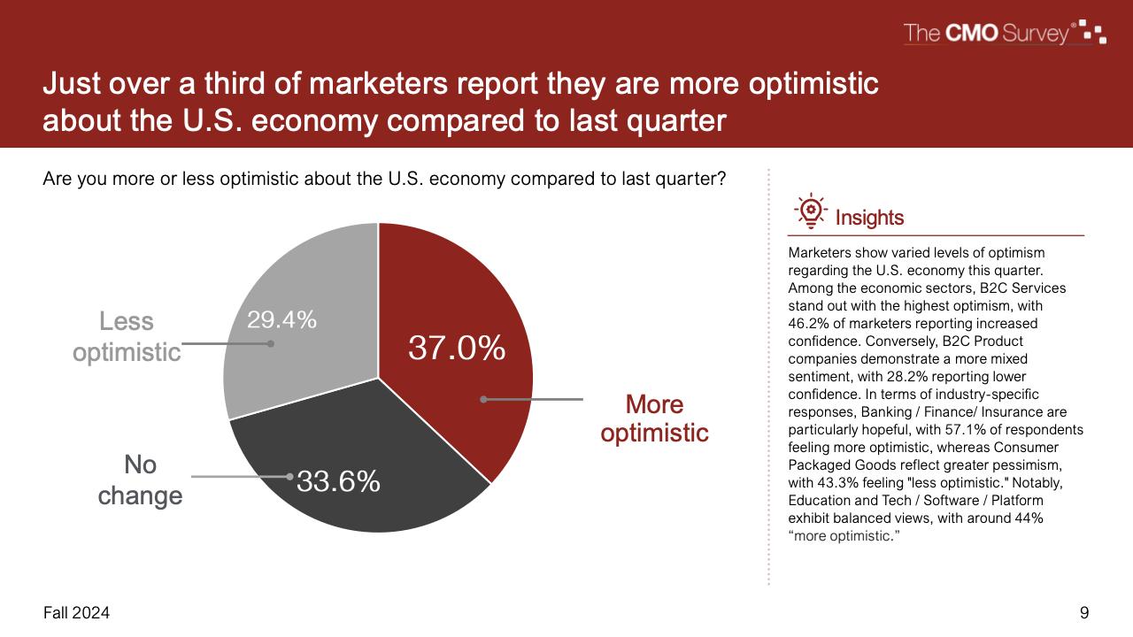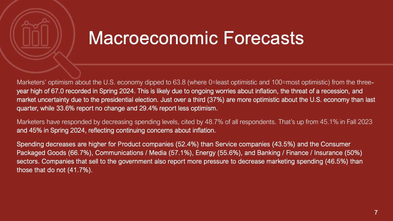 进一步下降的是首席营销官对营销费用占公司销售收入比例的估计。在最新的2024年秋季报告中,这一比例降至7.7%,是大流行和大流行后时代的最低比例。