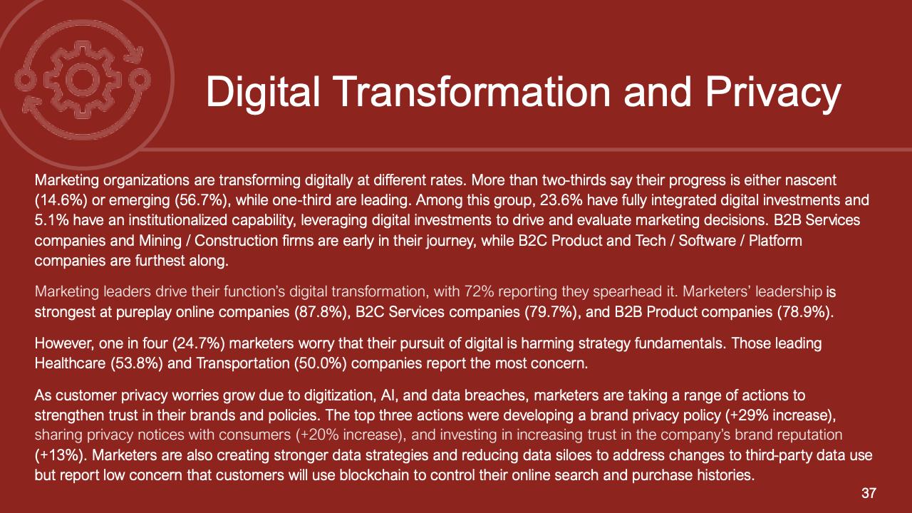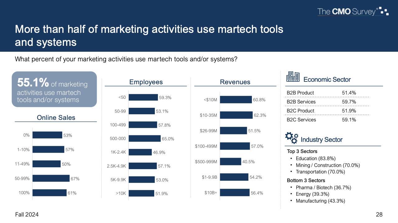 此外,当年初至今的利润低于预期,而公司的重点是削减开支时,首席营销官估计,44.6%的公司高管会削减其他领域的营销开支。虽然B2C服务(37.9%)公司是最不可能看到这种情况发生的公司,但在公司部门之间的估计差异较小。