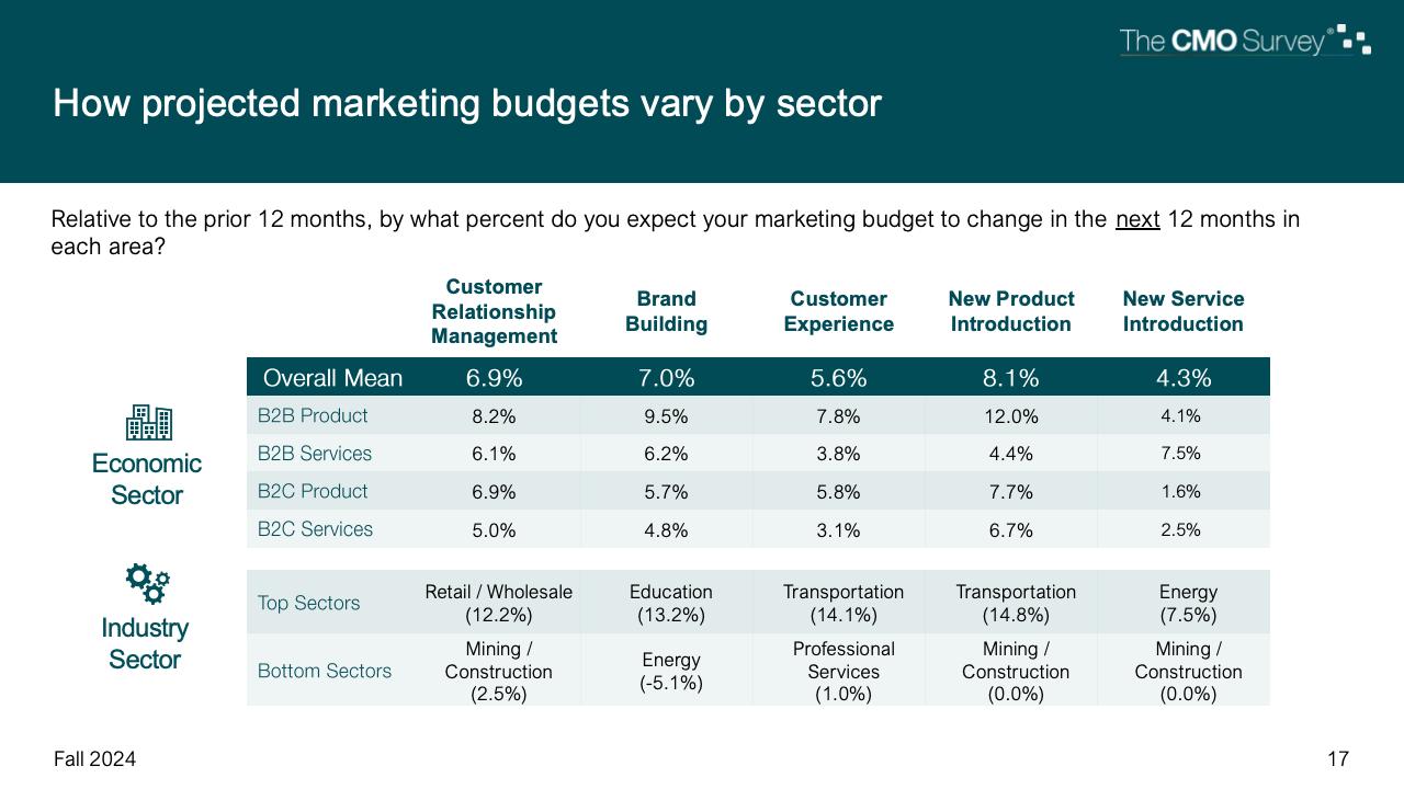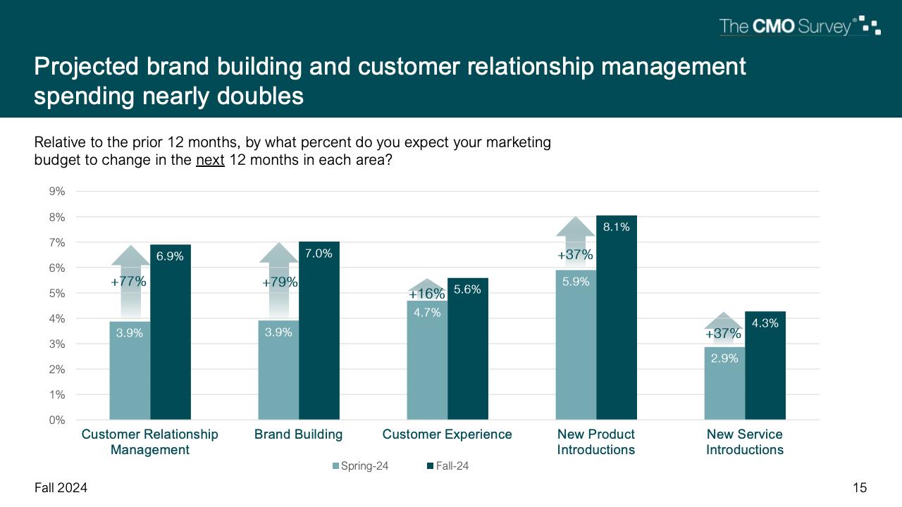 与今年早些时候(2024年春季版)相比,这项最新调查预计,明年客户关系管理(从3.9%上升到6.9%)、品牌建设(从3.9%上升到7%)、客户体验(从4.7%上升到5.6%)、新产品介绍(从5.9%上升到8.1%)和新服务介绍(从2.9%上升到4.3%)的支出增长速度将加快。