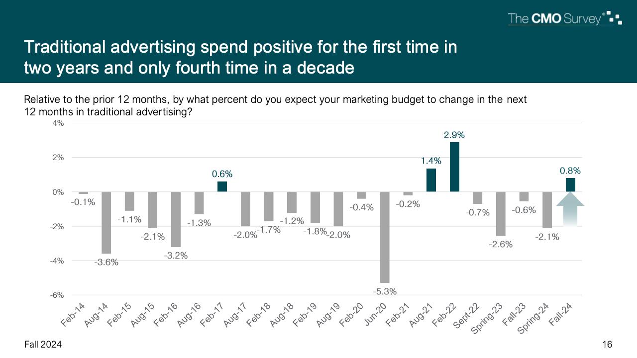 CMO调查每年进行两次,其中一个问题是CMO预计他们的传统广告预算在未来一年相对于过去一年将发生多大的变化。自2014年2月以来的21次报告中,对传统广告的正面预测只出现过3次。现在又多了一条,因为首席营销官们预计,明年他们的传统广告预算将小幅增长0.8%。