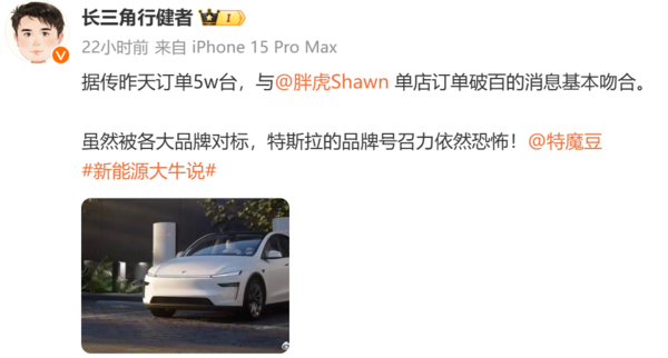 有汽车博主表示,据传1月10人特斯拉新Model Y上市当天,订单就有5万台,这一数字与另一博主单店订单破百的消息也基本吻合。该博主表示,虽然Model Y被各大品牌对标,特斯拉的品牌号召力依然非常恐怖。有特斯拉店面销售表示,门店10日当天接到了近300个订单,都是预定新Model Y的意向金用户。据他了解,即使现在交意向金排队,也要等到四、五月才能提车。