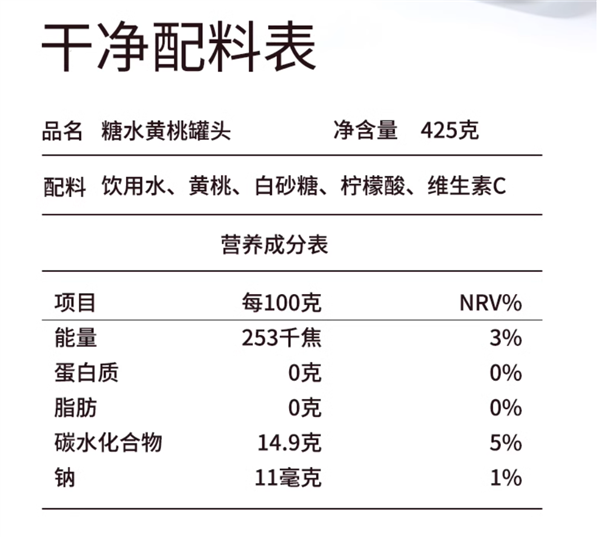 产品规格:甄选大果,每罐约含2-3颗大黄桃,新鲜黄桃直接制作,保留鲜果口感,配料表干净,仅黄桃、水、白砂糖、柠檬酸和维生素C。