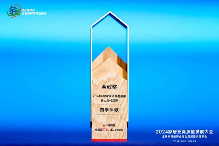 其中,四季沐歌凭借其卓越的经营表现与品牌影响力,荣获「金致奖 2024年度家居消费者信赖安心交付品牌」。