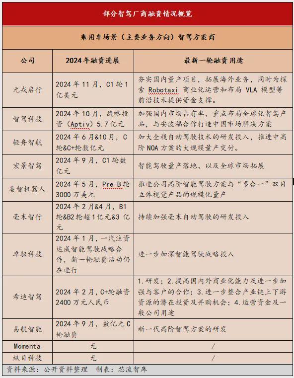据芯流智库的统计,元戎启行以约7亿元融资规模领跑全行业;智驾科技引战投5.7亿元紧随其后,轻舟智航、宏景智驾也分别引入数亿元。鉴智机器人、毫末智行、希迪智驾、易航智能等厂商,在融资市场均有所斩获,卓驭科技的新一轮融资活动仍在持续进行中。而Momenta、纵目科技则暂未有融资进展。