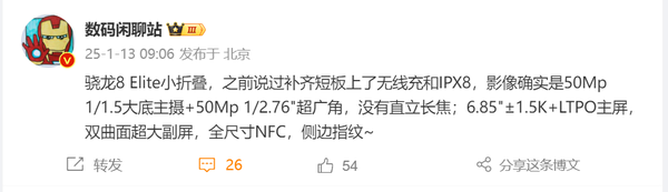 【CNMO科技消息】1月13日,CNMO注意到,博主“数码闲聊站”曝光了小米MIX Flip 2的核心配置:搭载骁龙8 Elite,支持无线充电和IPX8防水防尘。影像系统方面,小米MIX Flip 2采用50Mp 1/1.5英寸大底主摄与50Mp 1/2.76英寸超广角镜头的组合,但并未配备直立长焦镜头。