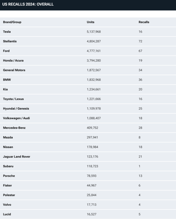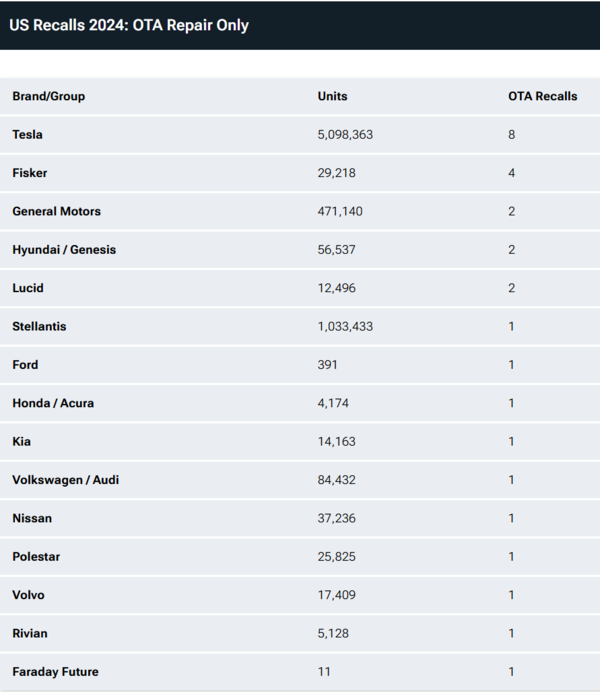 本田(包括其讴歌品牌)也紧随其后,排名第二,2024年共有379万辆本田车型需要车主前往经销商进行修理,稍微领先于Stellantis。另一大车企Stellantis位居“实体召回”榜单的第三位。该公司在2024年召回了总计约477万辆汽车,但其中有超过100万辆通过远程OTA更新解决,从而避免了客户前往维修站。尽管如此,Stellantis的实体召回依然高达377万辆,远远高于特斯拉。